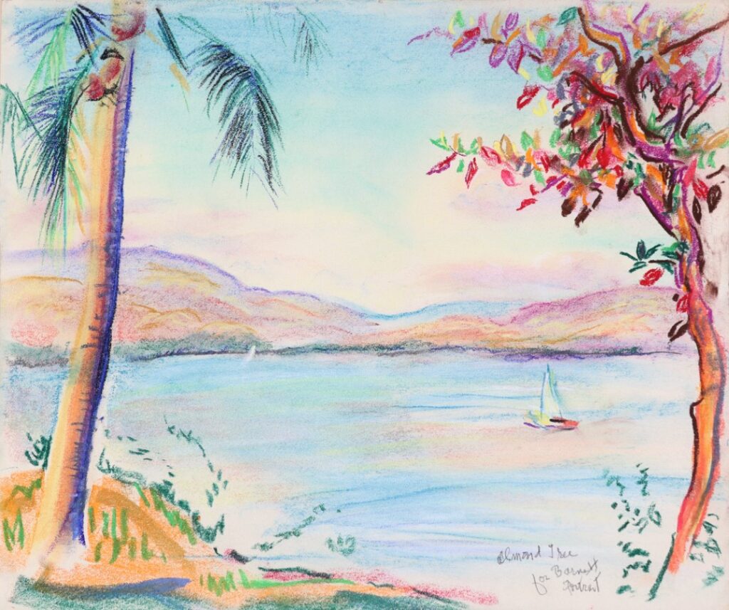 The Bay at Petit Goave (crayon pastel) Quick sketch by Aimée E. Ortlip while visiting Haiti in 1965. Inscription on lower right: “Almond Tree for Barnett Portrait”